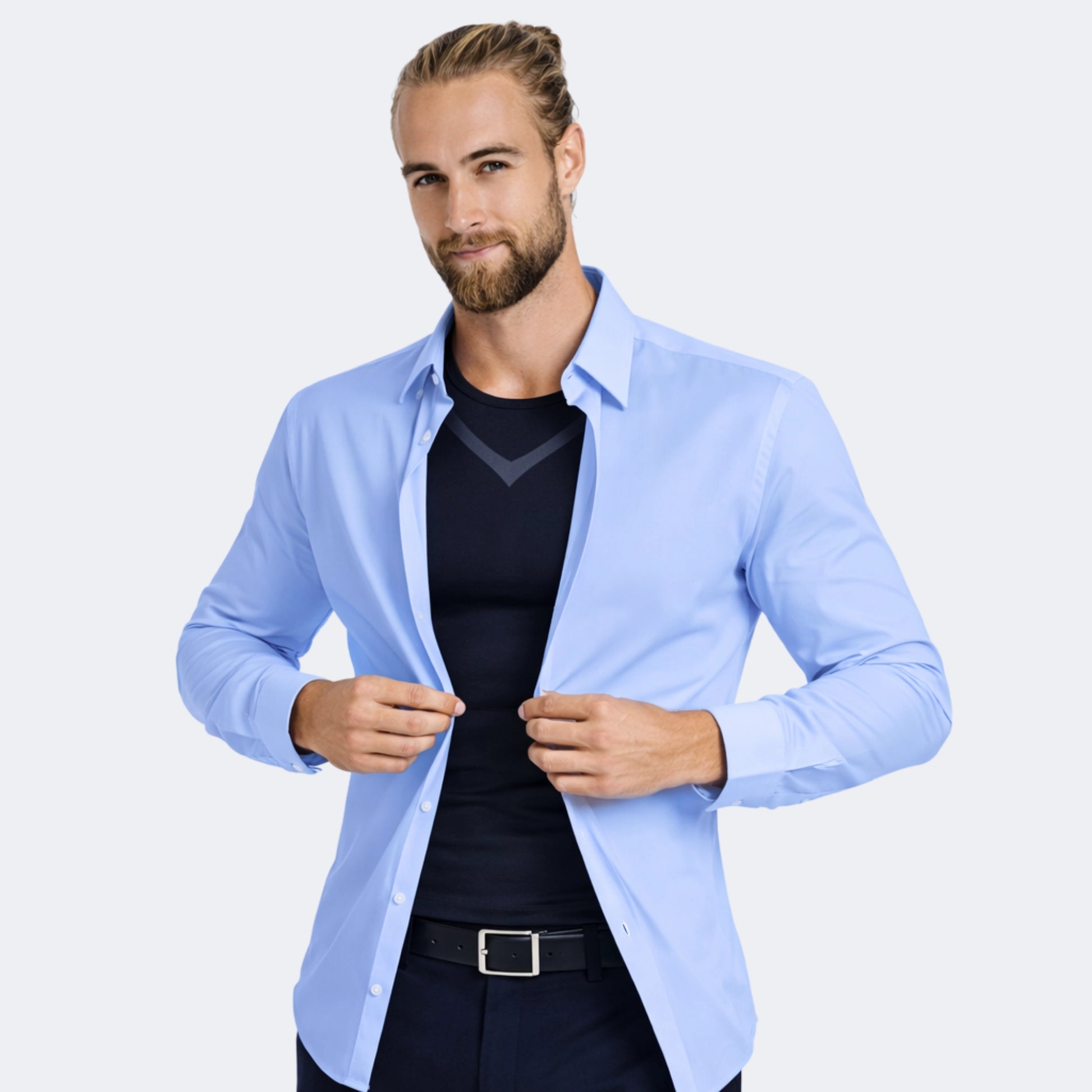 Das knitterarme Arnvall Hemd. Der unsichtbare Kompressionstop darunter. Zwei Produkte, ein Ergebnis, ein gepflegter Auftritt vom Morgen bis zum Abend.